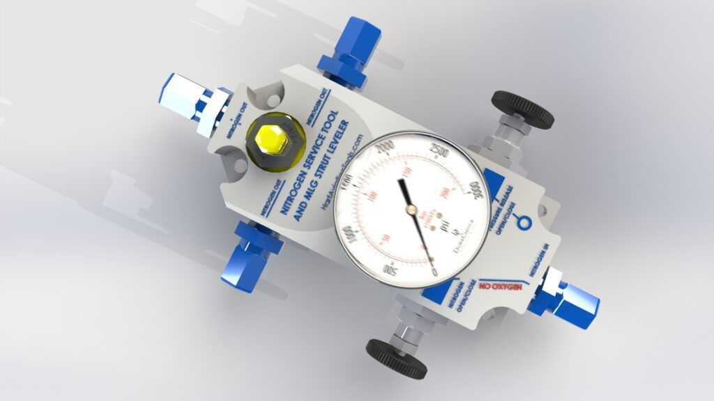 This is a versatile nitrogen service tool. The Strut (wing) Leveler was developed because of calls from the field for the need to charge both left and right main landing gear at the same time to easily get them to the same level. The two high-quality cartridge valves, (Control and Pressure Release), are rated at 3000 psi. It comes with standard AN-4 flared fittings, a high-pressure service valve, and a 1500 psi gauge. Lower pressure gauge models-200 psi and 800 psi are optional. Custom rated gauges are available on request.