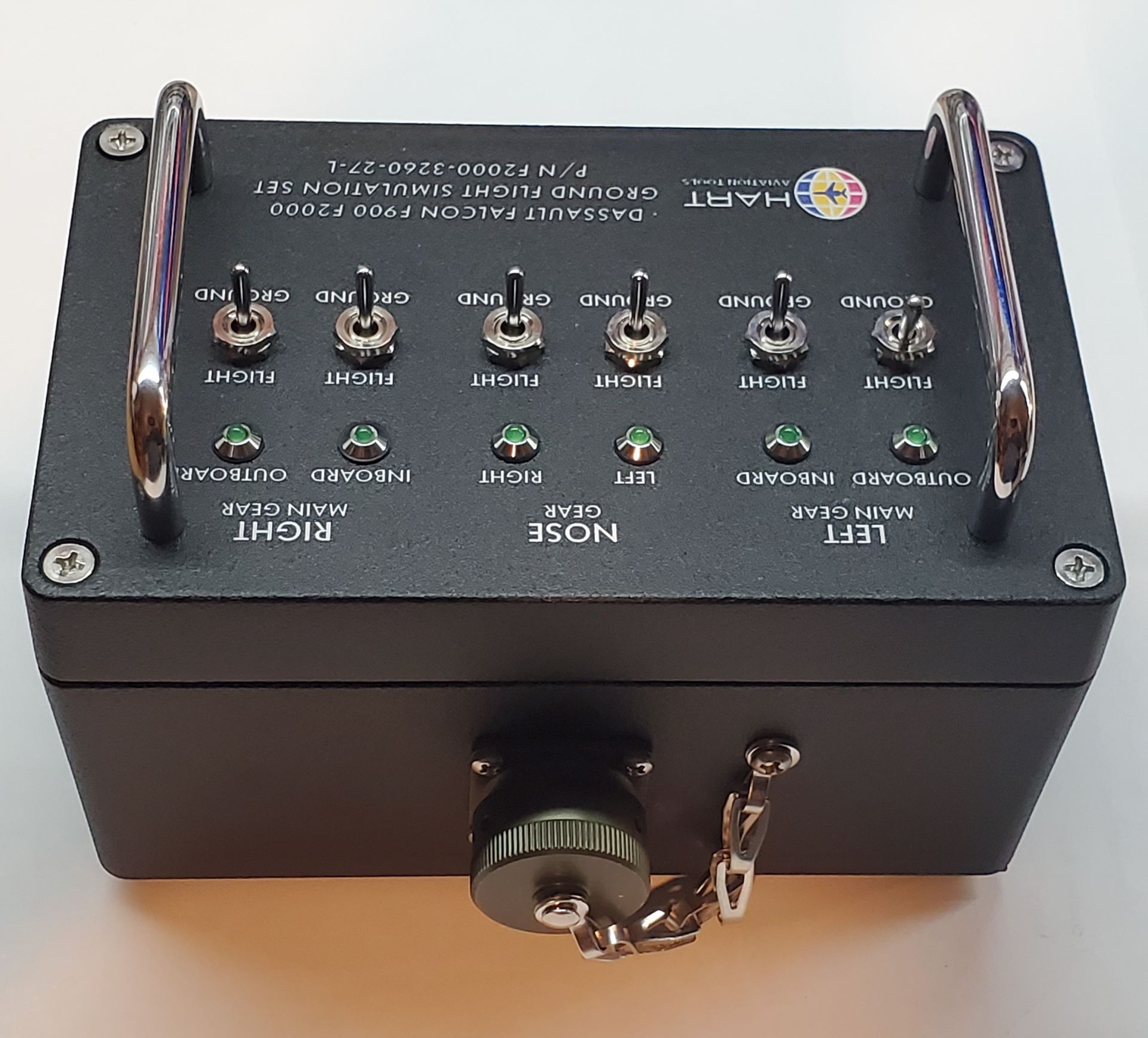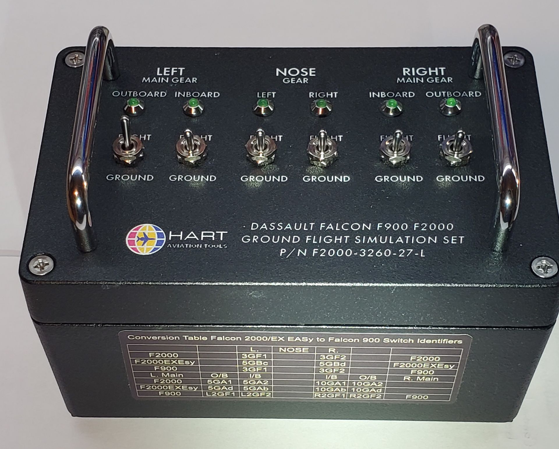 The Hart Aviation Tool Co. Ground/Flight Simulation Set, P/N F900PST-3200 is based on aircraft manufacturer's drawings of the ground flight circuits The chassis consists of six switches, wiring and Mil spec connectors and is used to simulate the action of the appropriate weight on wheels switches when used for testing or trouble shooting. This unit is functionally identical to the manufacturer's part number variants.