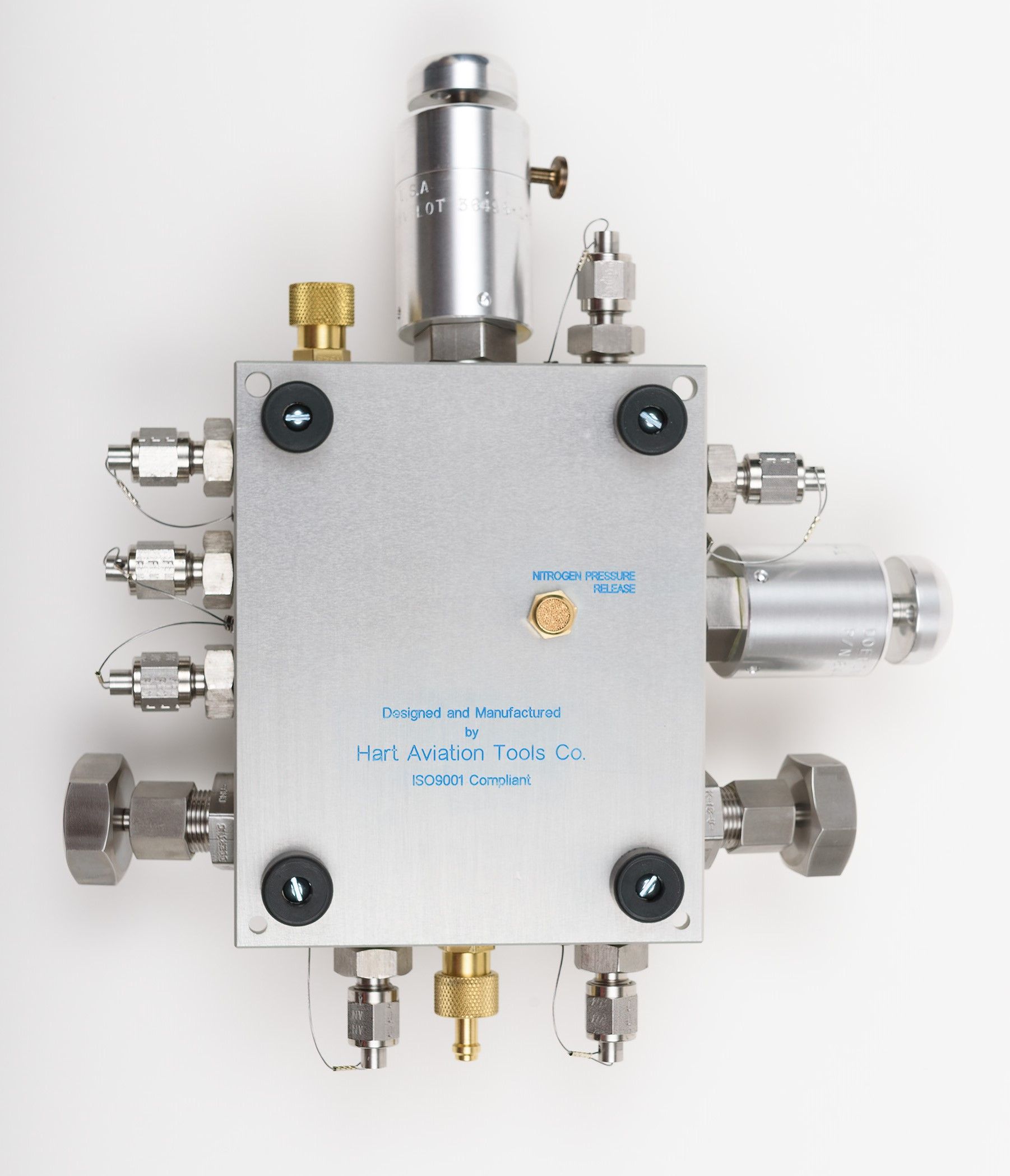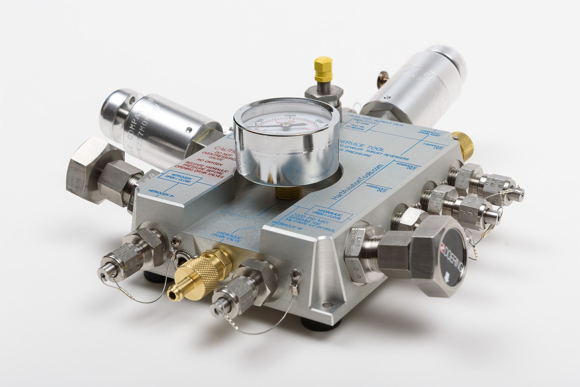 All the control valves are high quality cartridge valves rated to 5000 psi. The valve handles have locking features for holding the tool at any selected pressure. The tool is rated at 5000 psi on the nitrogen side and 60 psi on the hydraulic side. Hydraulic pressure can go as high as 2000 psi with both the drain valves in the closed position.