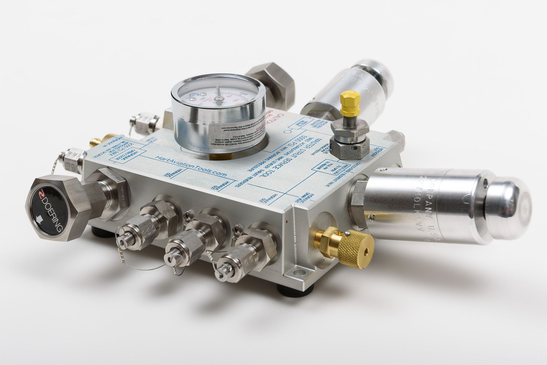 Use the Cross-over/Blow-out Valve to clean out the tool, for clearing out the residual hydraulic fluid with nitrogen, when you're finished. This prevents old gooey drying MIL-5606 hydraulic fluid from clogging up the insides. Then install the AN-4 flared fitting caps, that are attached at the fittings, to prevent contamination. Patent Pending.
